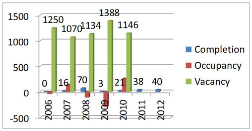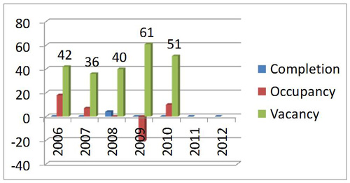 2010 completion quantity was 20600 square meters, mainly from a Tsuen Wan development project. This year’s occupancy reached 260700 square meters with 1145900 units being vacant, around 6.7% of total supply. Within the vacant units, 59% located in Twun Tong, Kwai Tsing, and Tseun Wan area.